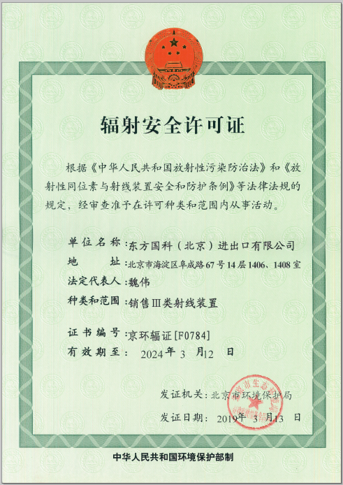 2019年3月,东方国科(北京)进出口有限公司(以下简称“东方国科”)取得Ⅲ类射线装置的《辐射安全许可证》。申请该项资质是开展与射线装置相关业务的前提,是国家对于从事射线装置业务单位的认可。